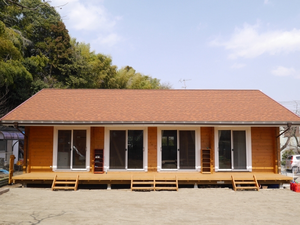 園舎が北風から子どもたちを守ってくれます。ウッドデッキはおひさまポカポカ。